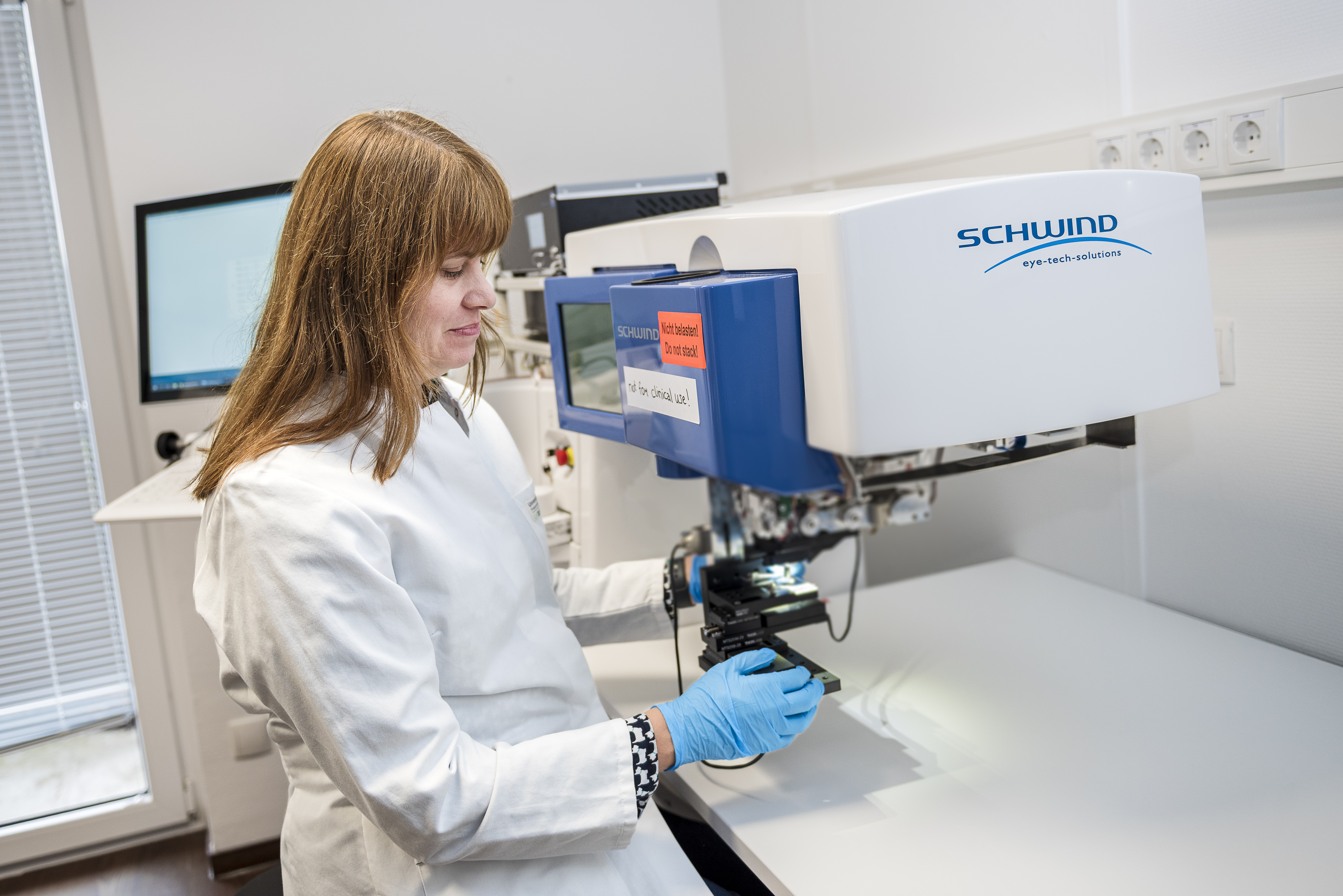 Joachim’s team is working with the company SCHWIND eye-tech-solutions on the project HARMONY, funded by the Federal Ministry of Research, Technology and Space, to develop a novel, non-invasive laser treatment method. “We want to change the refractive index of the cornea without any incisions,” explains Joachim as she discusses the goal of the LIRIC method (laser-induced refractive index change). The laser used for this, developed by SCHWIND, is a femto-second laser. The laser parameters are different from other procedures in that the pulses are well below the damage threshold, meaning there are no incisions or other damage to the tissue, although changes still occur.