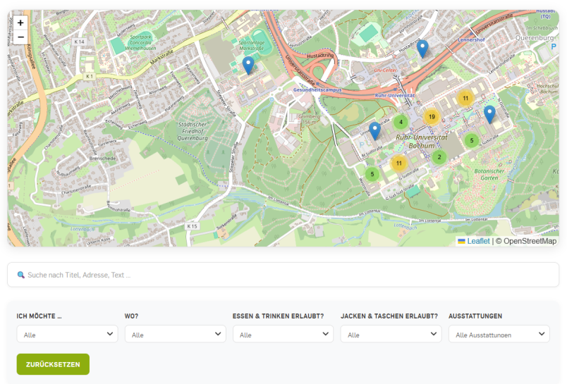 Auf dem Campus der Ruhr-Universität gibt es zahlreiche Orte, an denen gelernt, diskutiert, geschrieben oder gemeinsam gearbeitet wird. Viele davon bleiben im Studienalltag jedoch unsichtbar. Wer einen ruhigen Stillarbeitsplatz sucht, einen Ort für Gruppenarbeit, für Videokonferenzen oder für ein spontanes Brainstorming, findet ab sofort mit wenigen Klicks auf einer neuen interaktiven Lernort-Landkarte passende Vorschläge. Die Karte soll Orientierung geben – und zugleich Lust machen, den Campus neu zu erkunden.
