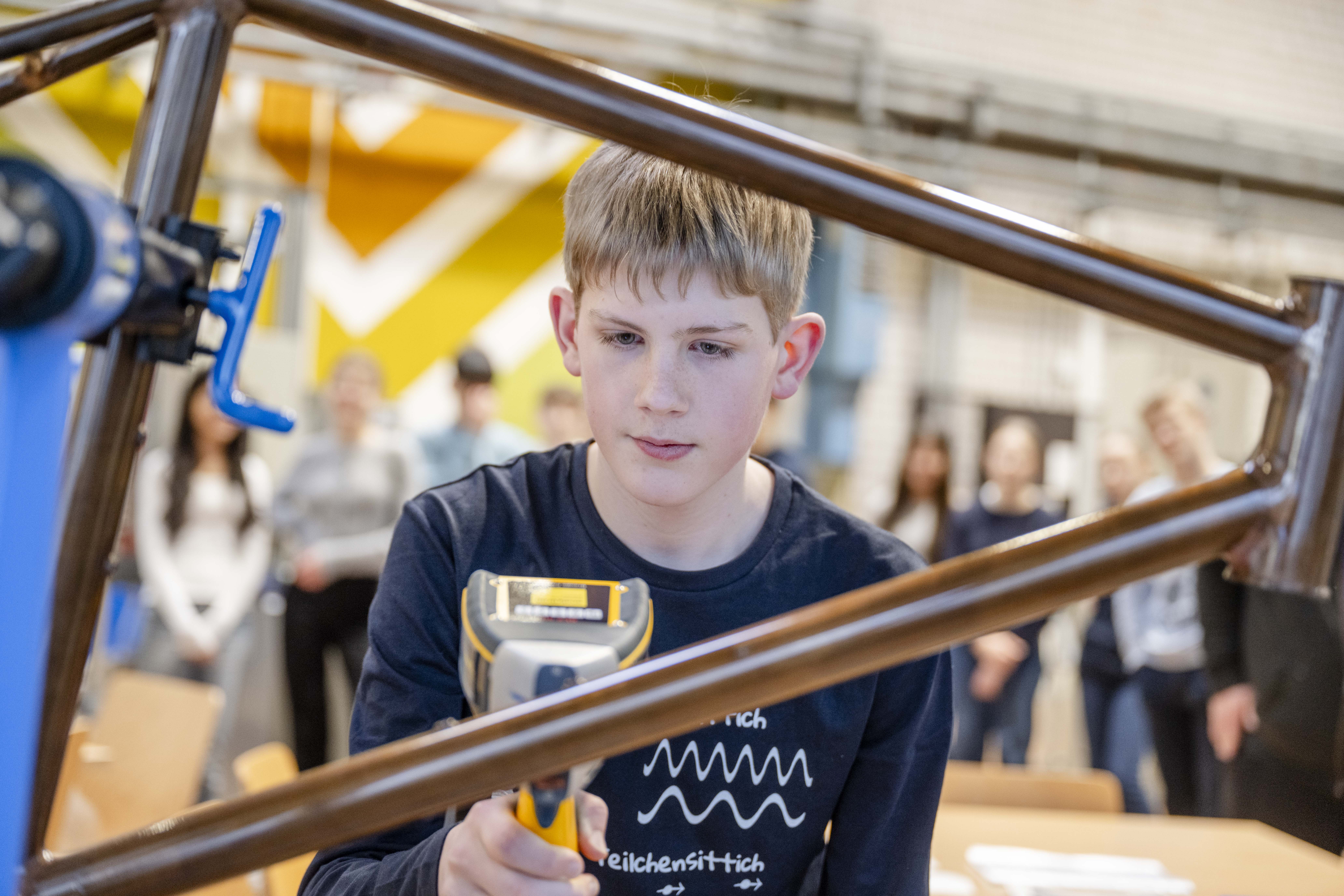Heute sind die Teilnehmenden zum zweiten Mal zu Gast bei Prof. Dr. Sebastian Weber in der Werkstoffforschung. Es geht darum, die Werkstoffe zu bestimmen, aus denen die einzelnen Bestandteile des Rades sind. Ein mobiles Röntgenspektrometer kann die nötigen Informationen liefern und zeigt die Kupferschicht und die darunter liegende Stahlbasis an. Sie kann auch den Titananteil des ultraleichten Wasserflaschenhalters identifizieren und das Material der Bremssättel und -Scheiben benennen. „Chemie macht Spaß“, sagt Greta, „und in einem Labor zu forschen, ist toll.“