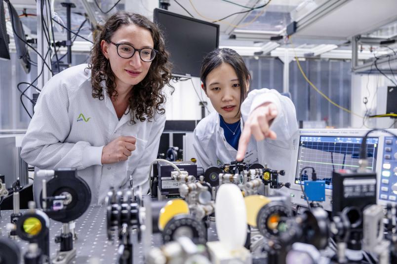 Clara Saraceno (links) und ihre Mitarbeiterin Anna Ono arbeiten daran, die Technologie von Femtosekundenlasern weiterzuentwickeln