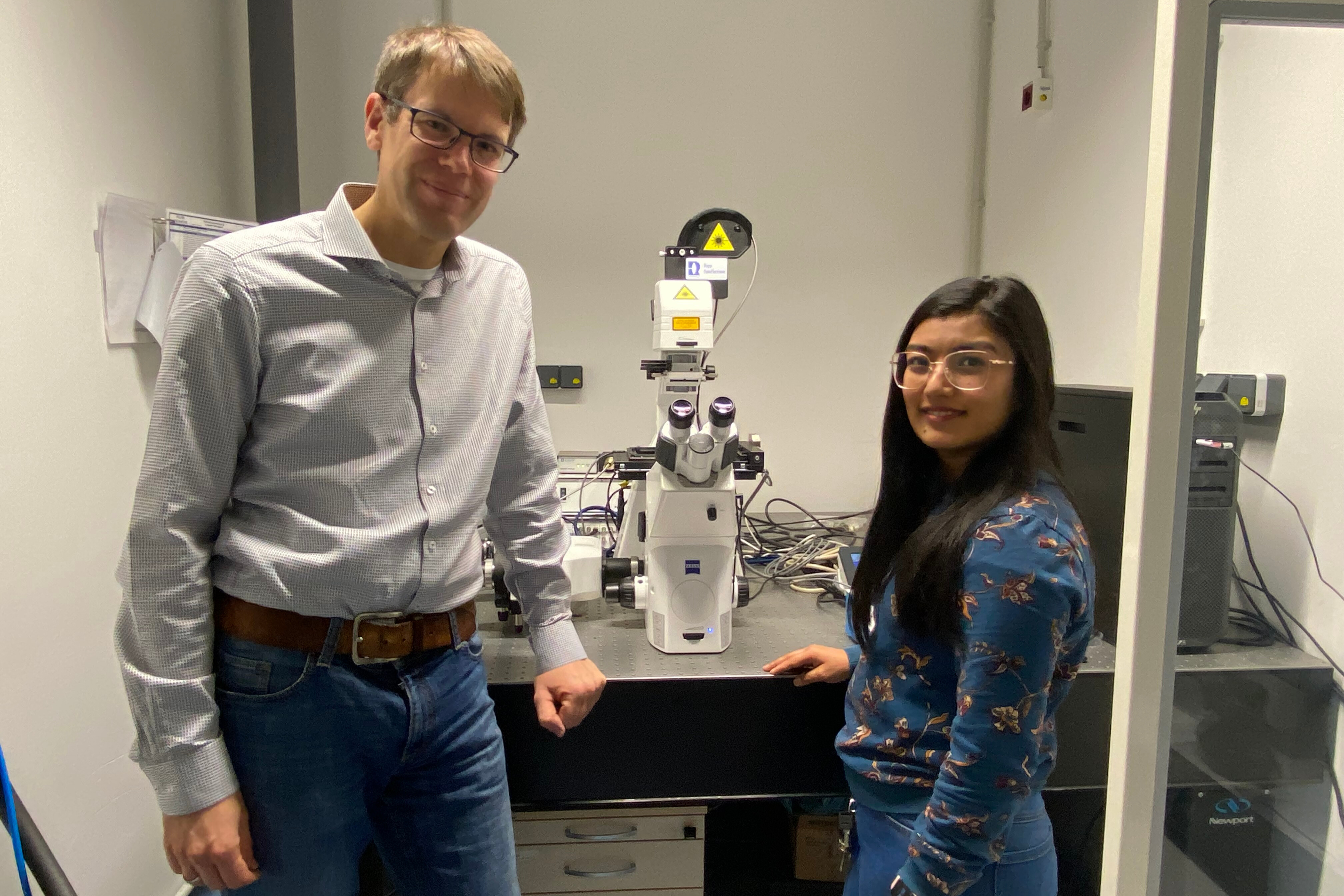 Simon Ebbinghaus und Puja Shresta (rechts) untersuchen Proteinbestandteile.